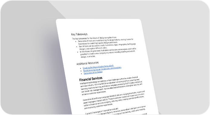 Key Takeaways The key takeaways for the future of design using Gen AI are: • Generative AI tools are revolutionizing the design industry, making it easier for businesses to create high-quality designs and visuals. • Gen AI tools can be used to create illustrations, logos, infographics, landing page designs, and explore different colors. • In the future, AI-generated illustrations will become commonplace, and it will be possible to create a new company or product, including branding and website design, in minutes. Additional Resources • Creating the future of advertising with AI • Revolutionizing Design Collaboration and Simulation • Generative AI for Design Financial Services Intelligent technology can address critical challenges within the modern financial services industry. With the NVIDIA accelerated computing platform powering deep learning, machine learning, and natural language processing (NLP) models, institutions can boost risk management, improve data-backed decisions, strengthen security, and enhance customer experiences. Generative AI and Large Language Models (LLMs) are changing how banks, insurers and asset managers interact with AI. These transformer models will impact every function within a financial services company, reducing costs, creating operational efficiencies, and improving customer experiences. Current Challenges in Financial Services are: • Consumers demand digitally immersive, personalized, intelligent omnichannel experiences across financial services such as banking, credit card, investing, insurance, and so on. • Market volatility, rising interest rates, regulatory changes, and Environmental Social and Government scoring demand banks analyze thousands of data streams in real-time for to identify new risks and opportunities. • Competition from Fintech, big tech, and large retailers. • Competition is increasing as companies vie for customers and their financial data. • Technologies such as open banking are increasing data portability across banks and expanding access to a rich partner ecosystem offering banking as a service platforms, enabling any company to become a “bank.” • IT leadership and data scientists are burdened by legacy IT systems and budget constraints, that are combined with demands to enable work-from-everywhere, enhance cybersecurity, and improve risk management, further straining bank infrastructure. Gen AI: Revolutionizing the Way Enterprises Work 21