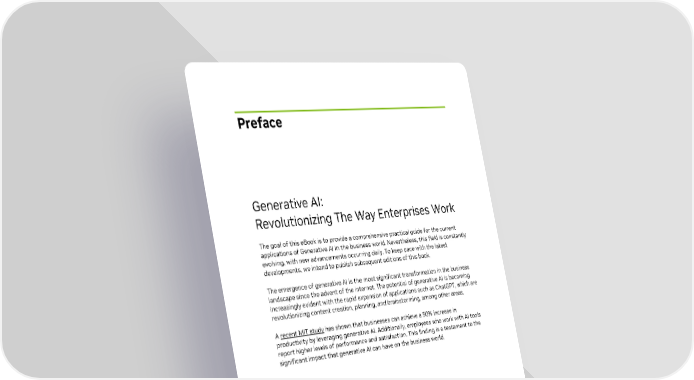 Preface Generative AI: Revolutionizing The Way Enterprises Work The goal of this eBook is to provide a comprehensive practical guide for the current applications of Generative AI in the business world. Nevertheless, this field is constantly evolving, with new advancements occurring daily. To keep pace with the latest developments, we intend to publish subsequent editions of this book. The emergence of generative AI is the most significant transformation in the business landscape since the advent of the internet. The potential of generative AI is becoming increasingly evident with the rapid expansion of applications such as ChatGPT, which are revolutionizing content creation, planning, and brainstorming, among other areas. A recent MIT study has shown that businesses can achieve a 50% increase in productivity by leveraging generative AI. Additionally, employees who work with AI tools report higher levels of performance and satisfaction. This finding is a testament to the significant impact that generative AI can have on the business world. Gen AI: Revolutionizing the Way Enterprises Work 3