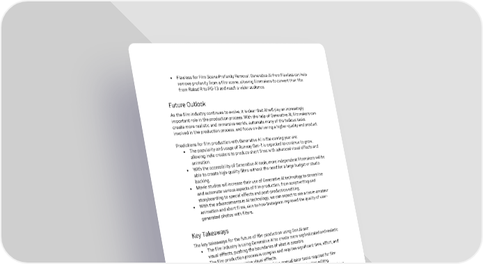 • Flawless for Film Scene Profanity Removal: Generative AI from Flawless can help remove profanity from a film scene, allowing filmmakers to convert their film from Rated R to PG-13 and reach a wider audience. Future Outlook As the film industry continues to evolve, it is clear that AI will play an increasingly important role in the production process. With the help of Generative AI, filmmakers can create more realistic and immersive worlds, automate many of the tedious tasks involved in the production process, and focus on delivering a higher-quality end product. Predictions for film production with Generative AI in the coming year are: • The popularity and usage of Runway Gen-1 is expected to continue to grow, allowing indie creators to produce short films with advanced visual effects and animation. • With the accessibility of Generative AI tools, more independent filmmakers will be able to create high-quality films without the need for a large budget or studio backing. • Movie studios will increase their use of Generative AI technology to streamline and automate various aspects of film production, from scriptwriting and storyboarding to special effects and post-production editing. • With the advancements in AI technology, we can expect to see a rise in amateur animation and short films, akin to how Instagram improved the quality of user- generated photos with filters. Key Takeaways The key takeaways for the future of film production using Gen AI are: • The film industry is using Generative AI to create more sophisticated and realistic visual effects, pushing the boundaries of what is possible. • The film production process is complex and requires significant time, effort, and skill to create immersive visual effects. • Generative AI can automate many of the manual labor tasks required for film production, such as creating visual effects and post-production editing. • Tools such as ChatGPT, Sudowrite, Gen-1 by RunwayML, and Flawless are helping automate various film production tasks, such as scriptwriting, shot list creation, storyboarding, special effects, and translations/dubbing. • As AI technology advances, we can expect to see more indie creators and amateur animators using Generative AI to create high-quality films with advanced visual effects. Additional Resources • The year’s most captivating visual effects in film using AI • Bring the future of Media and Entertainment into Focus • Generative AI for Film Production Gen AI: Revolutionizing the Way Enterprises Work 25