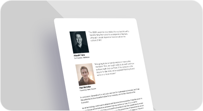 “The 2020’s would be recorded as the era that AI itself is transforming from a tool to a companion of humans, although it would depend on how we nurture the culture of AI’s.” Atsushi Taira Co-Founder, Mistletoe “AI is going to be as transformative or more as the transistor. First, we taught rocks to do math, and now we have math that can think. If the computer is the bicycle for the mind, we’ve upgraded that bicycle and we’re on a moon mission.” Paul McKellar Founding Team, Square In conclusion, Generative AI is not just a new tool for businesses to innovate, but it has the potential to be a transformative force in society, akin to the internet or the transistor. As AI technology continues to advance and become more accessible, it has the power to revolutionize entire industries and even the way we live our lives. It is crucial for businesses to stay ahead of the curve and incorporate AI into their operations to remain competitive in the years to come. By embracing the possibilities of Generative AI, we can unlock new levels of creativity, productivity, and innovation that will shape our future in ways we can't yet imagine. Businesses and Generative AI Businesses should start investing in the future today and consider the following questions to take advantage of Generative AI: • What is our Generative AI strategy? • How can we empower our team with these new tools? • Are we investing enough in the future of AI? • Which parts of our business could become obsolete in competition with these Gen AI-based new technologies? Gen AI: Revolutionizing the Way Enterprises Work 31