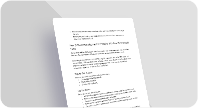 • Documentation can be a productivity killer, and many developers do not enjoy doing it. • Developing and testing new product ideas can take months or even years to determine market demand. How Software Development is Changing With New Generative AI Tools Generative AI (Gen AI) tools are transforming the way developers code. Just in the last few months, new tools and features have been announced almost every week. According to recent data from GitHub Co-pilot, engineers are coding 55% faster and experiencing 75% more fulfillment with the help of Generative AI tools. Feedback from engineers who have used AI for coding suggests that it can even be enjoyable, a noteworthy aspect of AI that is often overlooked. Popular Gen AI Tools Some of the tools for software development are: • Co-pilot by GitHub/Microsoft. • ChatGPT by OpenAI. • Ghostwriter by Replit. Top Use Cases Some of the top use cases are: • Inline code suggestions can be made while coding using Generative AI tools. • Documentation and test cases can be automatically generated by these tools. • The tools can also explain what the code does. • Code can be improved and simplified with the help of Generative AI. • The tools can even translate code from one programming language to another. Examples Some examples of use cases for using Generative AI tools in software development are: 1. Generative AI tools like Github Co-pilot are being used to suggest entire blocks of code, transforming the way developers write code and speeding up the coding process. 2. Using ChatGPT to translate code from one language to another can save developers significant amounts of time and effort, especially when working with multiple programming languages. ChatGPT's natural language processing capabilities can help ensure that the code is accurately translated, reducing the risk of errors, and improving efficiency. 3. Replit, in combination with the Codex model, can automatically explain what code does in natural language. This feature can save time and improve understanding for developers who are working with complex code. Gen AI: Revolutionizing the Way Enterprises Work 15