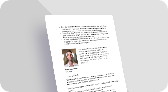 • Bing AI and LinkedIn: Marketers can leverage Bing AI's automation technology to create LinkedIn posts quickly and efficiently, saving time and allowing them to focus on other important tasks, such as analyzing post performance. • Notion AI for Blog Posts and Data Organization: Bloggers can use Notion AI to generate blog posts using AI-generated text and organize data, making it easier to find and use relevant information for their writing. • D-ID for Digital Avatars: Video marketers can use D-ID's digital avatars to create engaging video content that captures their audience's attention, providing a more personalized and interactive experience. “AI-powered content generation is transforming the way businesses create and distribute content. This is only the beginning. I think we'll start to see industries be disrupted and category leaders beat out by AI-first companies if they don’t adapt to this type of workflow from the ground up." Dave Rogenmoser CEO, Jasper Future Outlook The future of AI-generated content and marketing is promising. As AI tools become more advanced, the human role in content creation will become more creative about the topic to cover, and less about picking the perfect word. Predictions for management of content and marketing with Generative AI in the coming year are: • Professional writers who are skilled at using Gen AI tools can become dramatically more productive than traditional writers. • The AI technology will make it possible to create entire books that include contextually relevant charts and illustrations, without human intervention. • Writers can train AI on their past works, such as blog posts and tweets, and use that to create new content. • This development has the potential to revolutionize the quantity and quality of content created by businesses. Gen AI: Revolutionizing the Way Enterprises Work 18