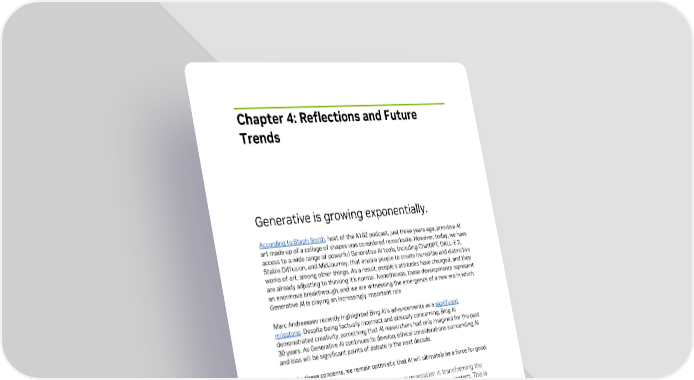 Chapter 4: Reflections and Future Trends Generative is growing exponentially. According to Steph Smith, host of the A16Z podcast, just three years ago, primitive AI art made up of a collage of shapes was considered remarkable. However, today, we have access to a wide range of powerful Generative AI tools, including ChatGPT, DALL-E 2, Stable Diffusion, and MidJourney, that enable people to create incredible and distinctive works of art, among other things. As a result, people's attitudes have changed, and they are already adjusting to thinking it’s normal. Nonetheless, these developments represent an enormous breakthrough, and we are witnessing the emergence of a new era in which Generative AI is playing an increasingly important role. Marc Andreessen recently highlighted Bing AI's advancements as a significant milestone. Despite being factually incorrect and ethically concerning, Bing AI demonstrated creativity, something that AI researchers had only imagined for the past 30 years. As Generative AI continues to develop, ethical considerations surrounding AI and bias will be significant points of debate in the next decade. Despite these concerns, we remain optimistic that AI will ultimately be a force for good. “AI-powered content generation is transforming the way businesses create and distribute content. This is only the beginning. I think we'll start to see industries be disrupted and category leaders beat out by AI-first companies if they don’t adapt to this type of workflow from the ground up." Taizo Son CEO, Mistletoe Generative AI for good in Healthcare and Pharma Gartner predicts that “By 2025, more than 30% of new drugs and materials will be systematically discovered using generative AI techniques, up from zero today.” Gen AI: Revolutionizing the Way Enterprises Work 29