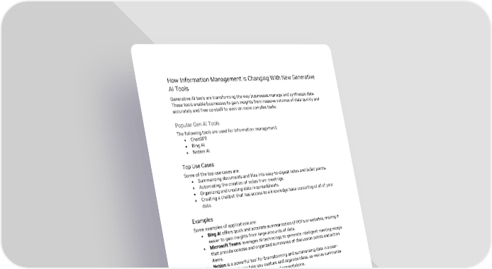 How Information Management is Changing With New Generative AI Tools Generative AI tools are transforming the way businesses manage and synthesize data. These tools enable businesses to gain insights from massive volumes of data quickly and accurately and free up staff to work on more complex tasks. Popular Gen AI Tools The following tools are used for information management: • ChatGPT • Bing AI • Notion AI Top Use Cases Some of the top use cases are: • Summarizing documents and files into easy-to-digest notes and bullet points. • Automating the creation of notes from meetings. • Organizing and creating data in spreadsheets. • Creating a chatbot that has access to a knowledge base consisting of all of your data. Examples Some examples of applications are: • Bing AI offers quick and accurate summarization of PDFs or websites, making it easier to gain insights from large amounts of data. • Microsoft Teams leverages AI technology to generate intelligent meeting recaps that provide concise and organized summaries of discussion points and action items. • Notion is a powerful tool for brainstorming and summarizing data in a user- friendly way. It can help you capture and organize ideas, as well as summarize important data points for reports and presentations. Future Outlook The potential of generative AI in the field of information management is vast. With the ability to synthesize data quickly and accurately, businesses can focus on creating value from their data rather than managing it. In the future, Generative AI tools will continue to transform the field of information management. Predictions for Generative AI in the coming year are: • Chatbots will be able to comprehend all of a company's data, including internal documents, notes, spreadsheets, and meeting transcripts. Gen AI: Revolutionizing the Way Enterprises Work 13