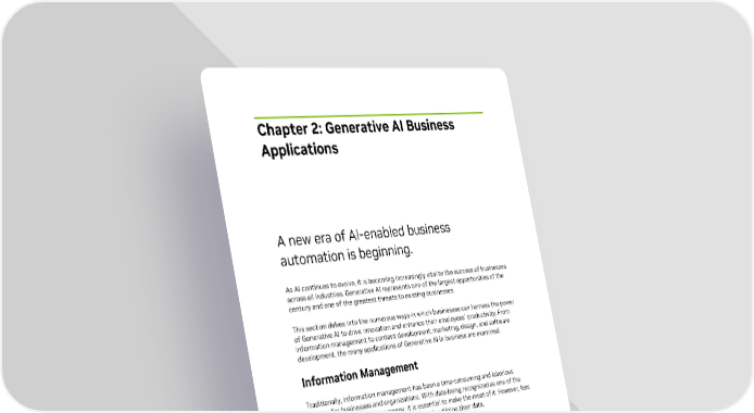Chapter 2: Generative AI Business Applications A new era of AI-enabled business automation is beginning. As AI continues to evolve, it is becoming increasingly vital to the success of businesses across all industries. Generative AI represents one of the largest opportunities of the century and one of the greatest threats to existing businesses. This section delves into the numerous ways in which businesses can harness the power of Generative AI to drive innovation and enhance their employees’ productivity. From information management to content development, marketing, design, and software development, the many applications of Generative AI in business are examined. Information Management Traditionally, information management has been a time-consuming and laborious process for businesses and organizations. With data being recognized as one of the most valuable assets of a company, it is essential to make the most of it. However, less than half of companies feel they are effectively utilizing their data. Key Issues in Information Management Organizations run into the following key issues: • It takes a lot of time to put together and organize data. • The amount of data created on the internet is increasing at an exponential rate. • It's hard to figure out important business insights from a huge amount of data. • Hiring people to manage and organize data is expensive. Gen AI: Revolutionizing the Way Enterprises Work 12