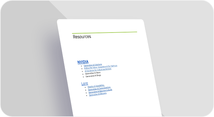 Resources NVIDIA • Generative AI Solutions • Riding the Wave: Generative AI for Startups • AI Solutions for Industries | NVIDIA • Generative AI News • Generative AI Blogs Lore • Weekly AI Newsletter • Generative AI Tools Directory • Generative AI Beginner’s Guide • Generative AI Glossary Gen AI: Revolutionizing the Way Enterprises Work 33