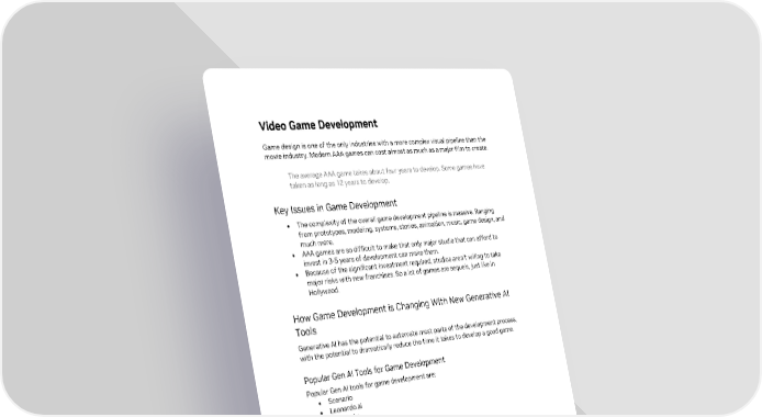 Video Game Development Game design is one of the only industries with a more complex visual pipeline than the movie industry. Modern AAA games can cost almost as much as a major film to create. The average AAA game takes about four years to develop. Some games have taken as long as 12 years to develop. Key Issues in Game Development • The complexity of the overall game development pipeline is massive. Ranging from prototypes, modeling, systems, stories, animation, music, game design, and much more. • AAA games are so difficult to make that only major studio that can afford to invest in 3-5 years of development can make them. • Because of the significant investment required, studios aren’t willing to take major risks with new franchises. So a lot of games are sequels, just like in Hollywood. How Game Development is Changing With New Generative AI Tools Generative AI has the potential to automate most parts of the development process, with the potential to dramatically reduce the time it takes to develop a good game. Popular Gen AI Tools for Game Development Popular Gen AI tools for game development are: • Scenario • Leonardo.ai • LumaLabs Top Use Cases Some of the top use cases are: • Create game assets. • Help code in Unreal Engine 5 and Unity. • Create user-generated content. Examples Some examples for using Generative AI tools for game development are: • Scenario for Character Asset Creation: Video game developers can use Scenario to create high-quality character assets quickly and efficiently, providing a helpful tool for streamlining the game development process. Gen AI: Revolutionizing the Way Enterprises Work 26