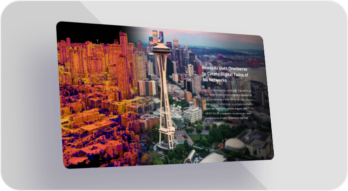 Heavy.AI Uses Omniverse to Create Digital Twins of 5G Networks HEAVY.AI developed an application framework on Omniverse for telecommunications companies to build digital twins of their networks. This powerful application will allow them to combine multibillion- point lidar scans and satellite imagery with HEAVY.AI's RF propagation models to simulate performance of radio networks in real time.