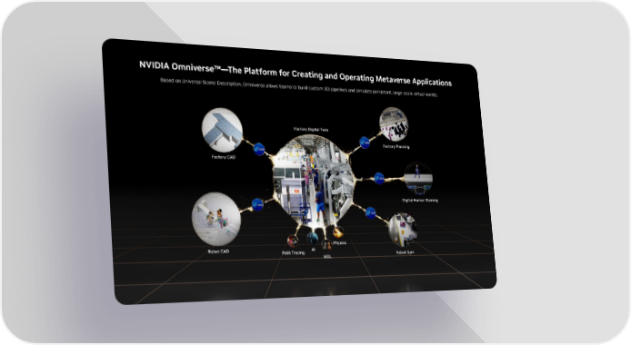 NVIDIA Omniverse™—The Platform for Creating and Operating Metaverse Applications Based on Universal Scene Description, Omniverse allows teams to build custom 3D pipelines and simulate persistent, large-scale virtual worlds. Factory Digital Twin Factory Planning Factory CAD Digital Human Training Physics Robot CAD Path Tracing AI MDL Robot Gym