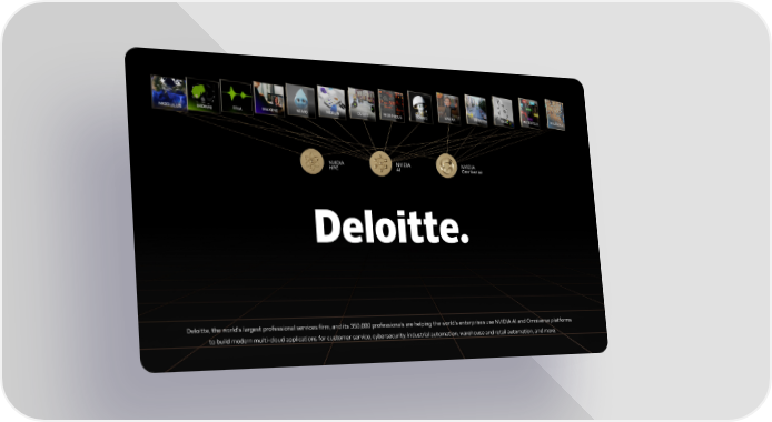 NVIDIA NVIDIA NVIDIA HPC AI Omniverse Deloitte, the world’s largest professional services firm, and its 350,000 professionals are helping the world’s enterprises use NVIDIA AI and Omniverse platforms to build modern multi-cloud applications for customer service, cybersecurity, industrial automation, warehouse and retail automation, and more.