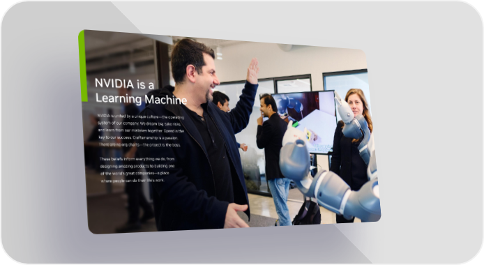 NVIDIA is a Learning Machine NVIDIA is united by a unique culture—the operating system of our company. We dream big, take risks, and learn from our mistakes together. Speed is the key to our success. Craftsmanship is a passion. There are no org charts—the project is the boss. These beliefs inform everything we do, from designing amazing products to building one of the world’s great companies—a place where people can do their life’s work.